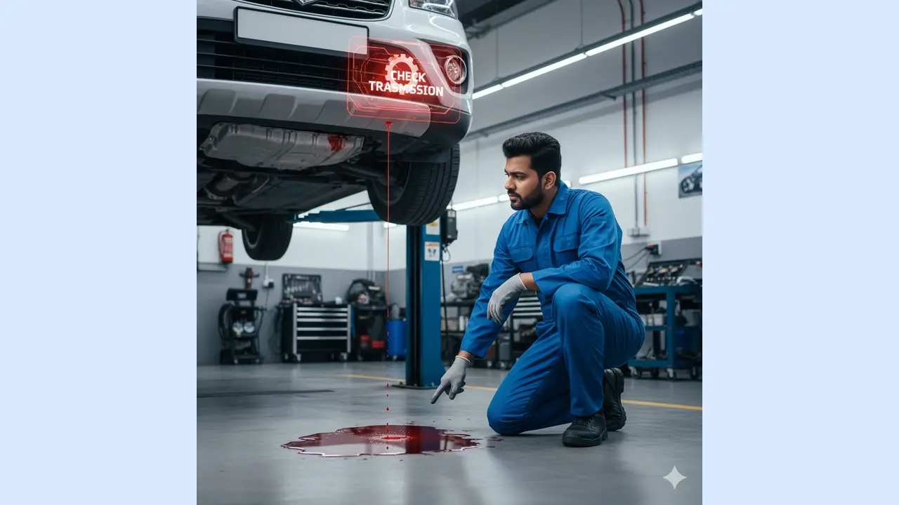 - लीकेज: गाड़ी के नीचे लाल रंग का लिक्विड गिरना ट्रांसमिशन ऑयल लीक है।